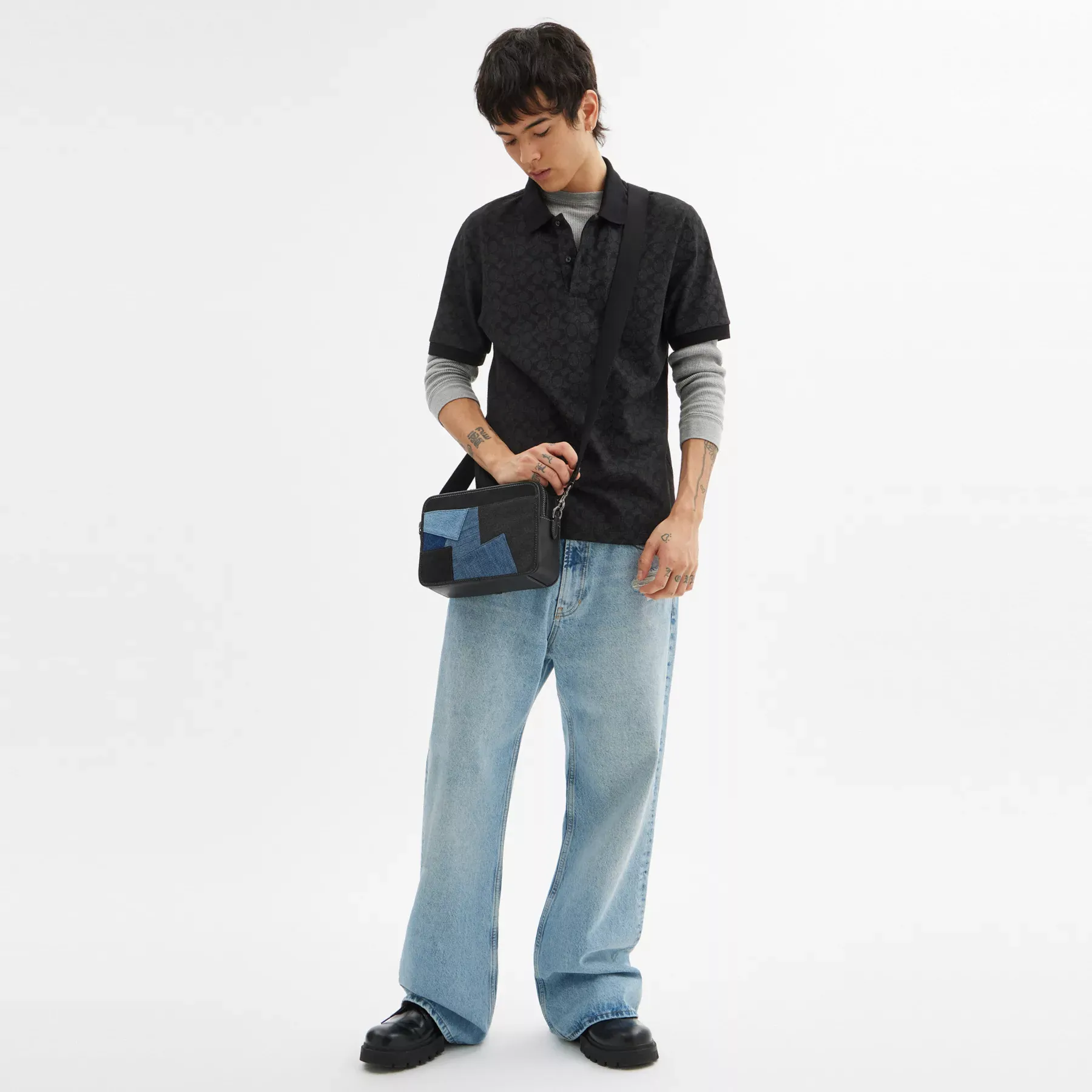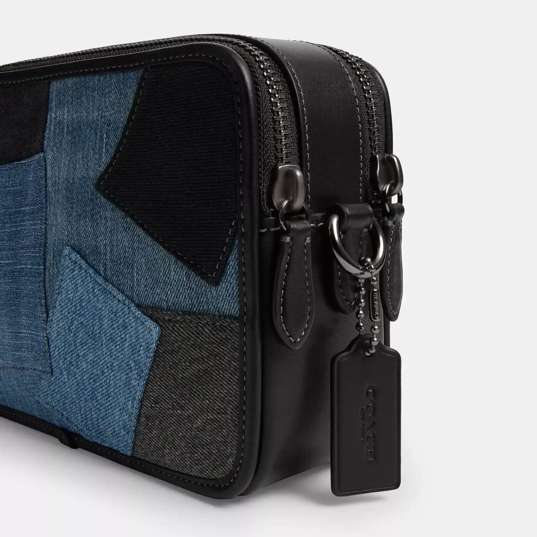 For adventures near and far, our Charter is designed to make every journey, commute and errand feel like a first-class experience. This structured crossbody has two zip compartments to keep you organized 24/7 and a lightweight adjustable webbing strap for versatile wear. It’s crafted of refined leather and a mosaic patchwork of beautifully loveworn repurposed denim inspired by the endless possibilities of secondhand garments and our commitment to reducing our impact on the planet.