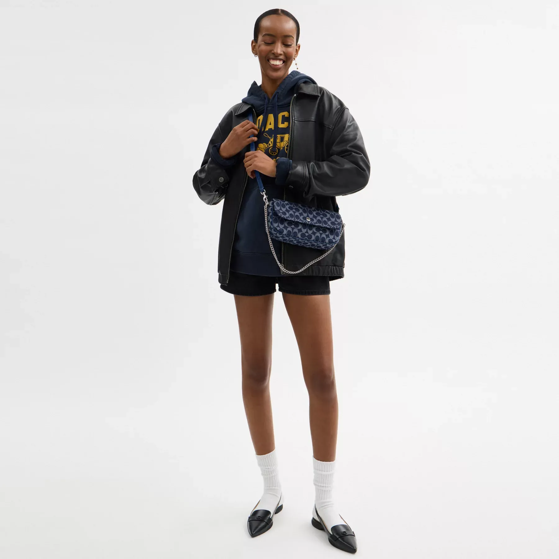- Signature denim and refined calf leather