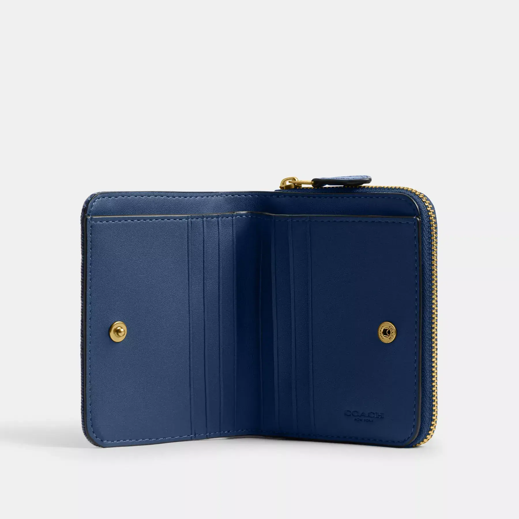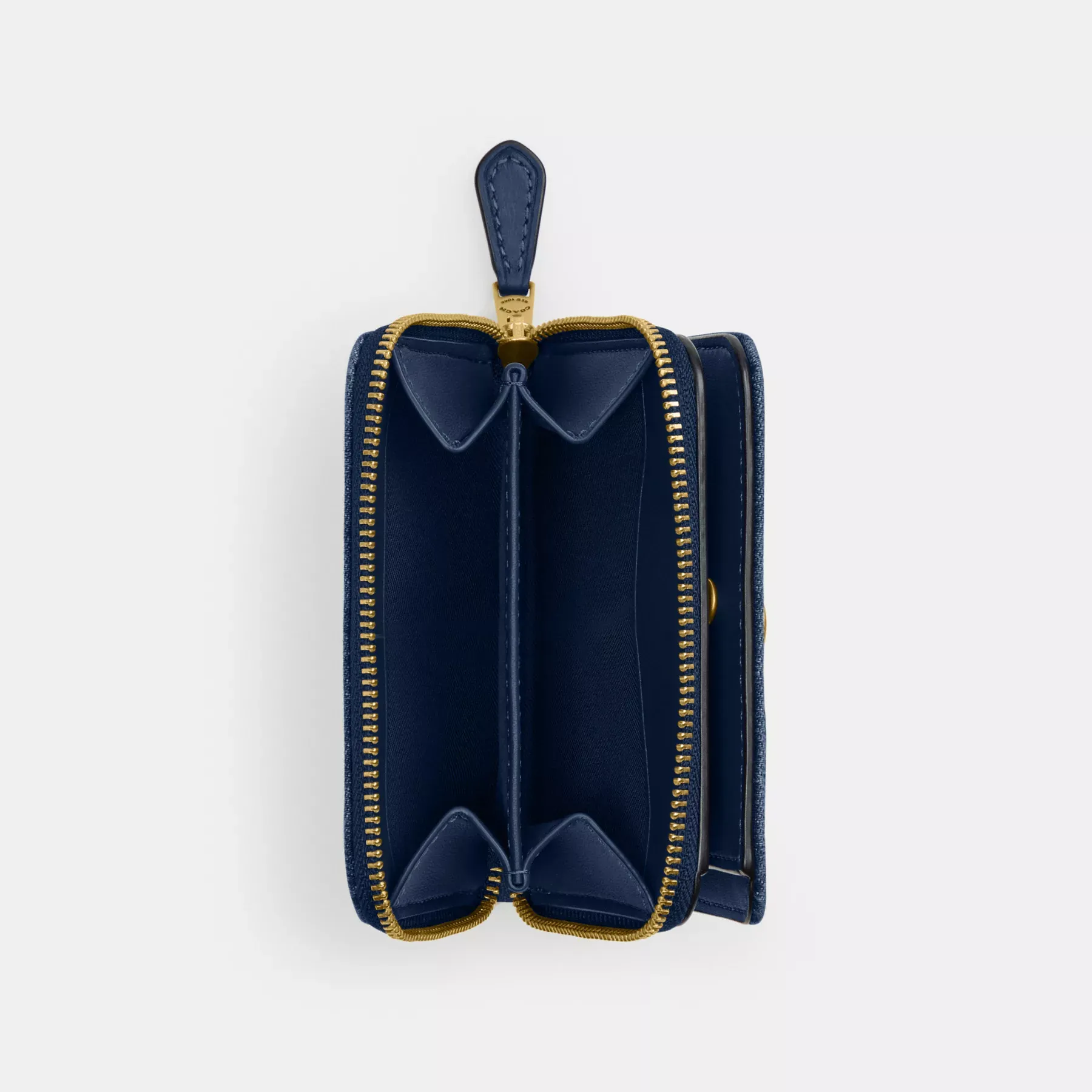 Detailed with contrast stitching and our Signature hardware, this compact refined leather and denim billfold wallet features a convenient exterior zip pocket for coins, receipts, earbuds and other small essentials. It unsnaps to reveal eight card slots and a full-length bill compartment.