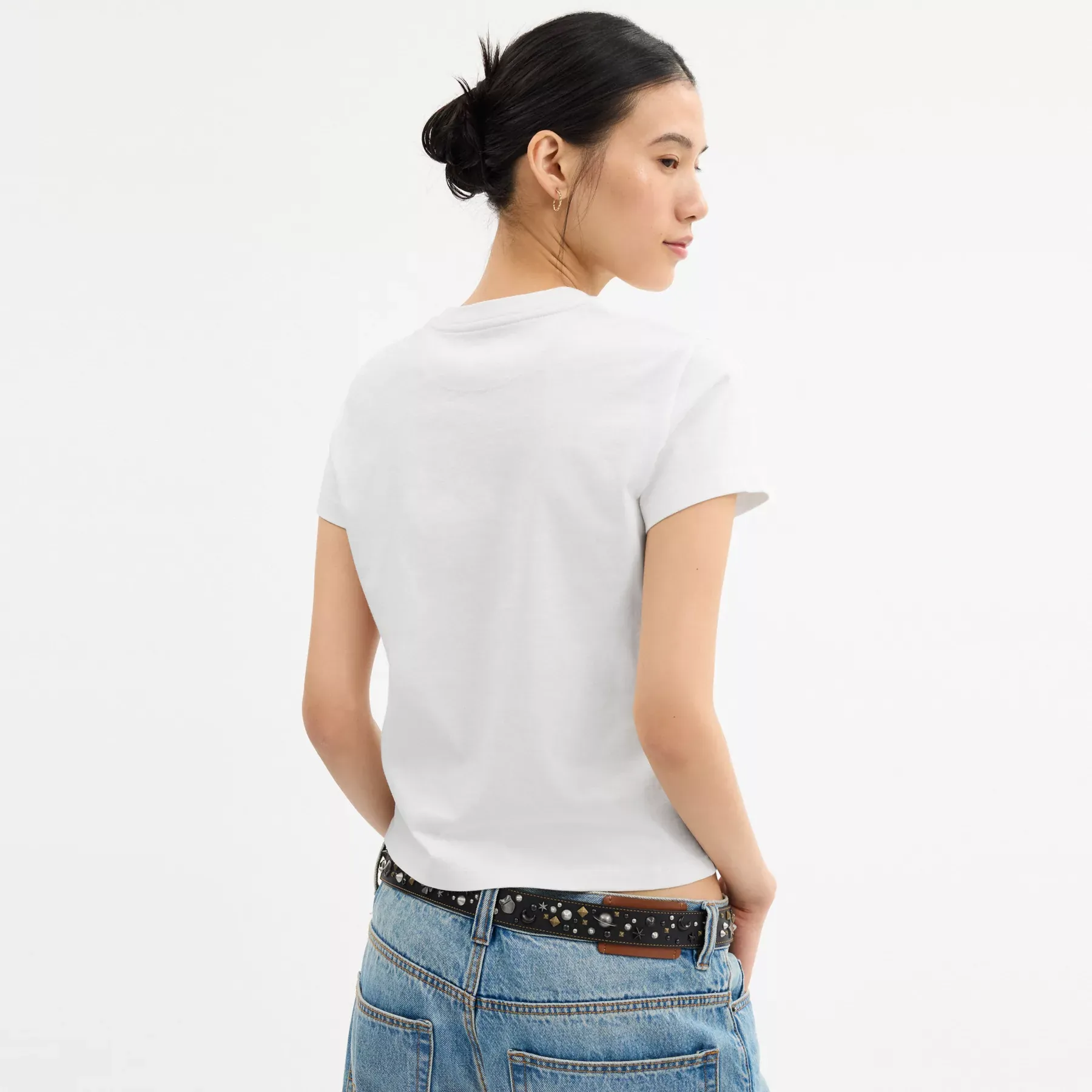 ,Crafted of organic cotton made without the use of harmful chemicals or fertilizers, this ‘90s-fit T-shirt is printed with a Coach graphic featuring our iconic Horse and Carriage motif. It’s finished with a ribbed crew neckline.