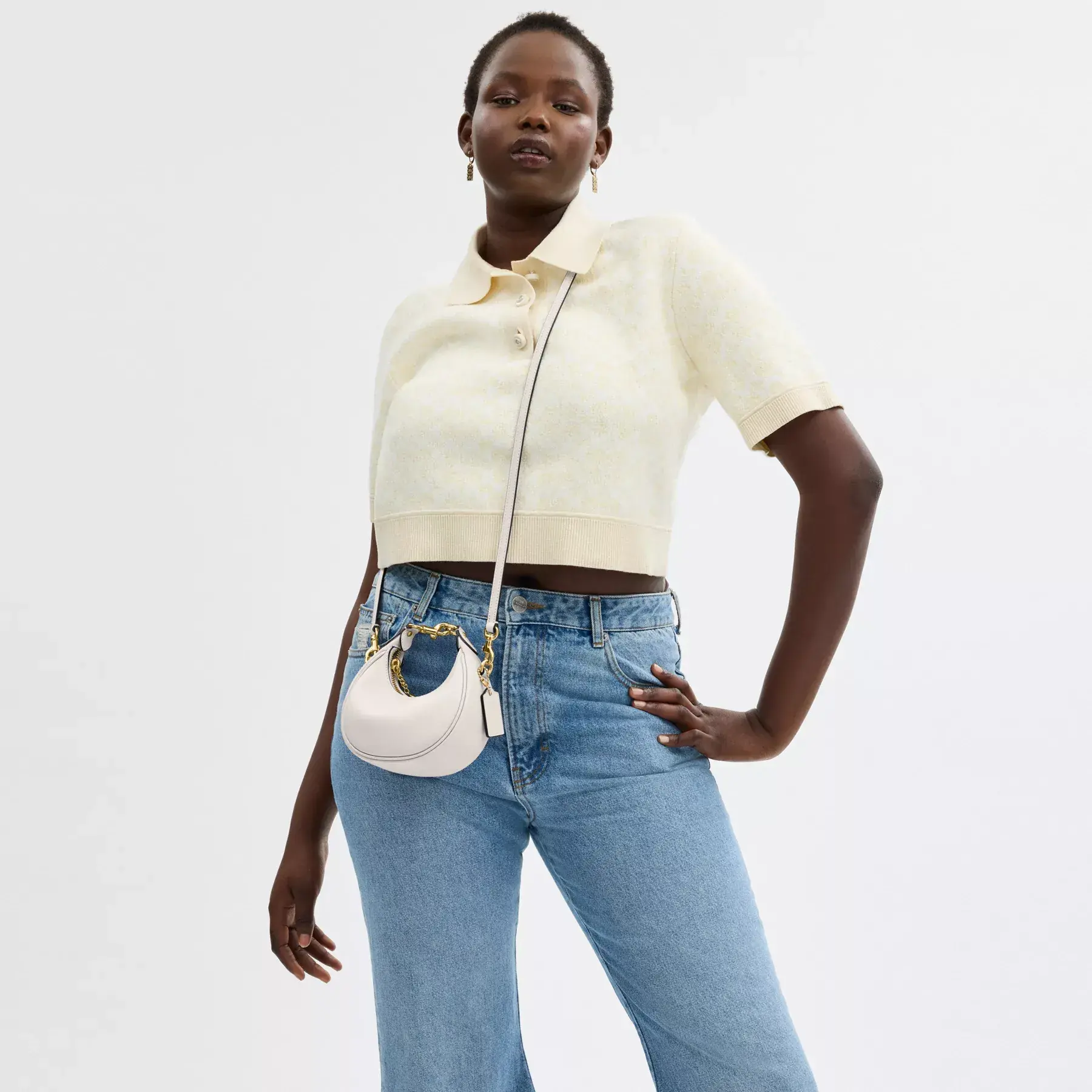 Ahead of the curve, our Jonie is a rounded style that’s part crescent silhouette, part hobo and all attitude. The compact style is crafted of buttery soft glovetanned leather and finished with a secure zip-top closure detailed with our C hardware. Carry by hand and wear as a wristlet with the interlocking top handle for nights out or add the detachable leather crossbody strap for days on the go. (Explore the possibilities.)