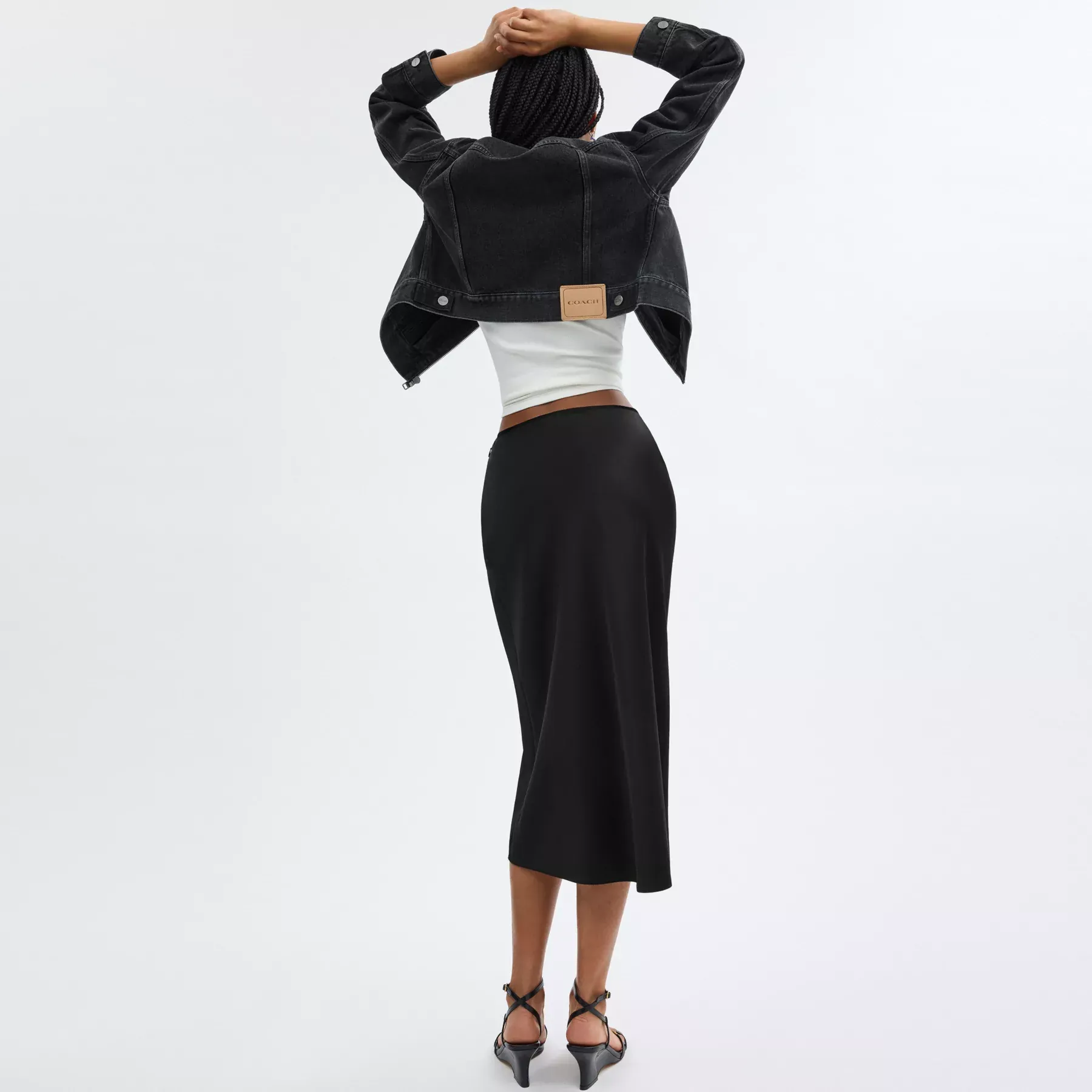 ,Slip into easy, elegant style with this ‘90s-inspired bias-cut satin midi skirt. Finished with a hidden zipper closure, the versatile design is detailed with our embroidered cursive Coach script at the waistband for a subtle heritage touch.