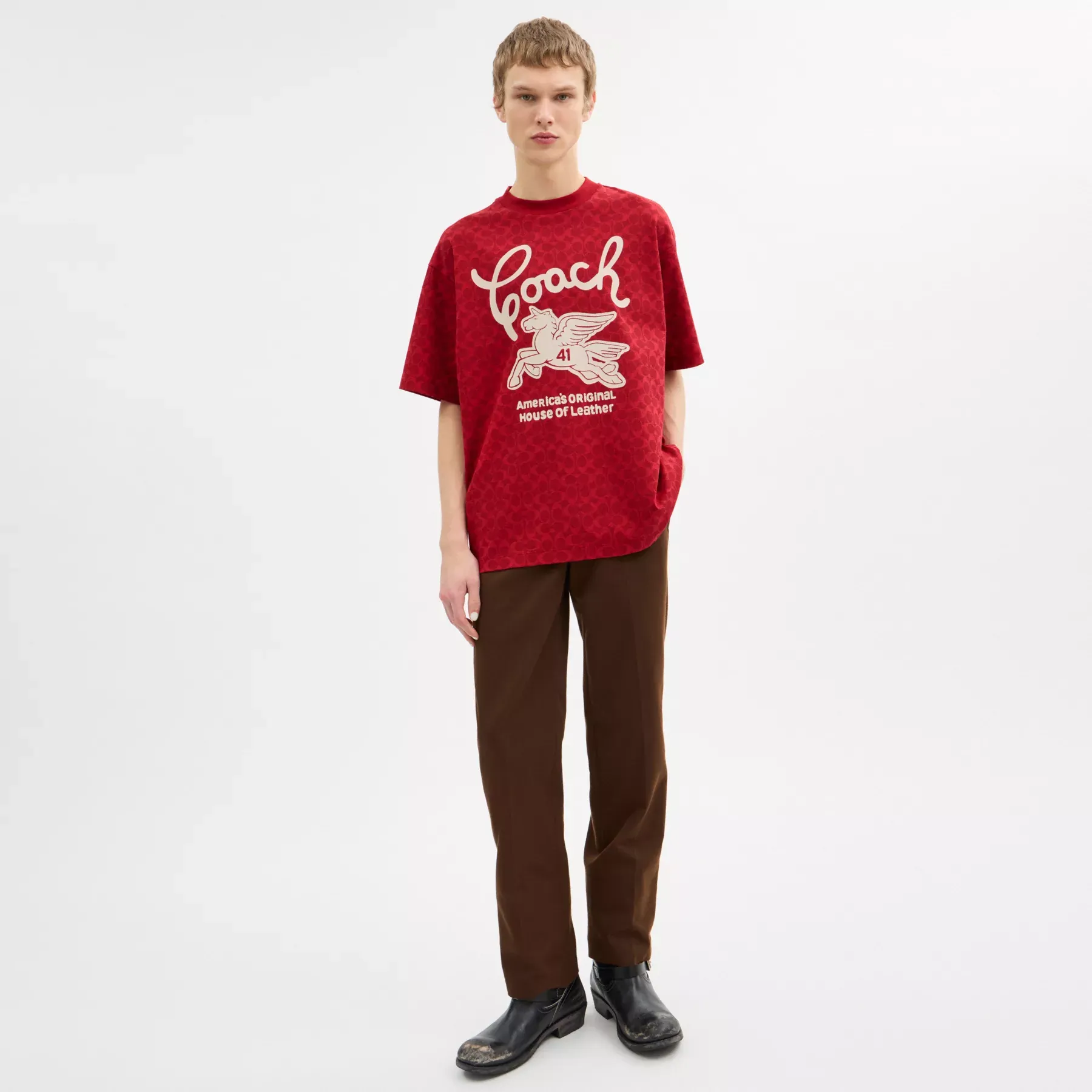 ,Inspired by varsity mascot patches on vintage letterman jackets, this Signature T-shirt features a whimsical graphic detailed with our flying Coach Pegasus. Designed with a relaxed fit, it’s crafted of organic cotton made without the use of harmful chemical fertilizers and pesticides.