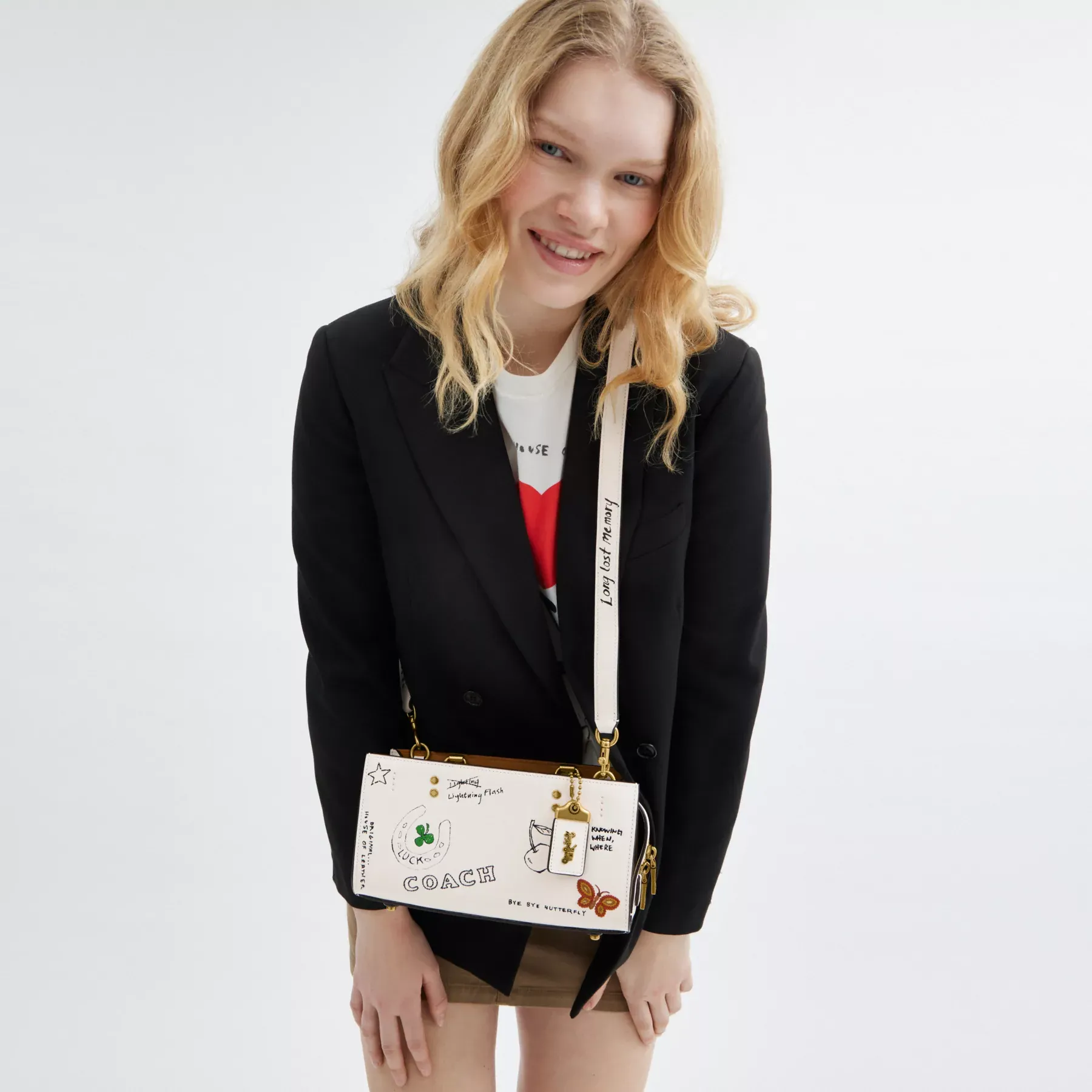 Inspired by free spirits, rebels and dreamers, the aptly named Rogue is a go-anywhere bag. Crafted of buttery soft glovetanned leather featuring our Coach Sketch print, a playful doodle motif of whimsical drawings and phrases inspired by artistic notebook scribbling, the 26 has an elongated baguette shape perfectly sized for day or night. With space to hold your phone, wallet, keys, and other small essentials, the compact style has two open compartments and a secure center zip compartment. It’s finished with distinctive luggage top handles and detachable straps for shoulder or crossbody wear.