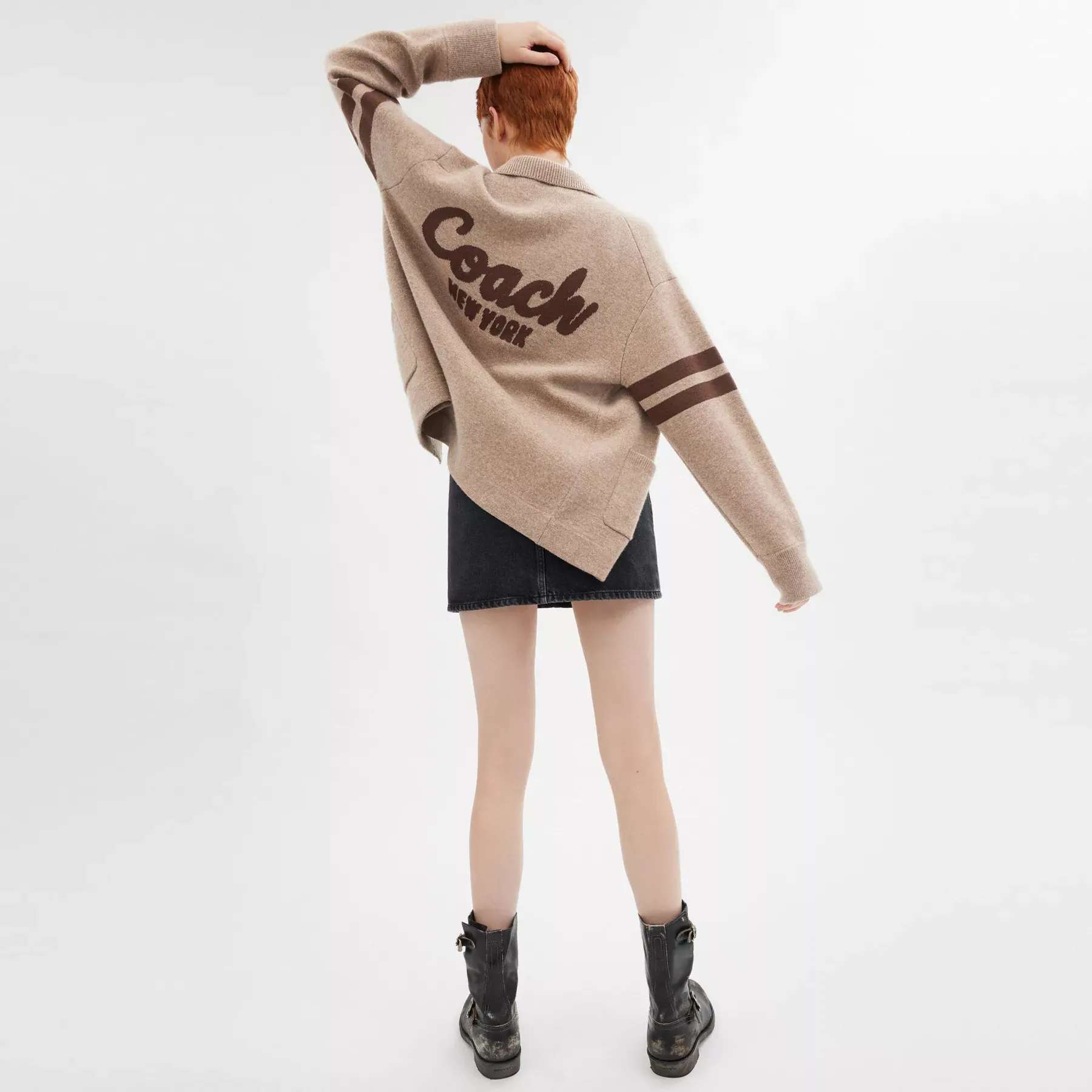 ,Give me a C. Inspired by sporty vintage styles, this polo collar button-front cardigan is crafted of a soft blend of cotton, wool and cashmere. Detailed with our cursive script “C” on the front and our cursive Coach script at the back, the oversized silhouette is finished with patch pockets and our Varsity Stripe at the sleeves.