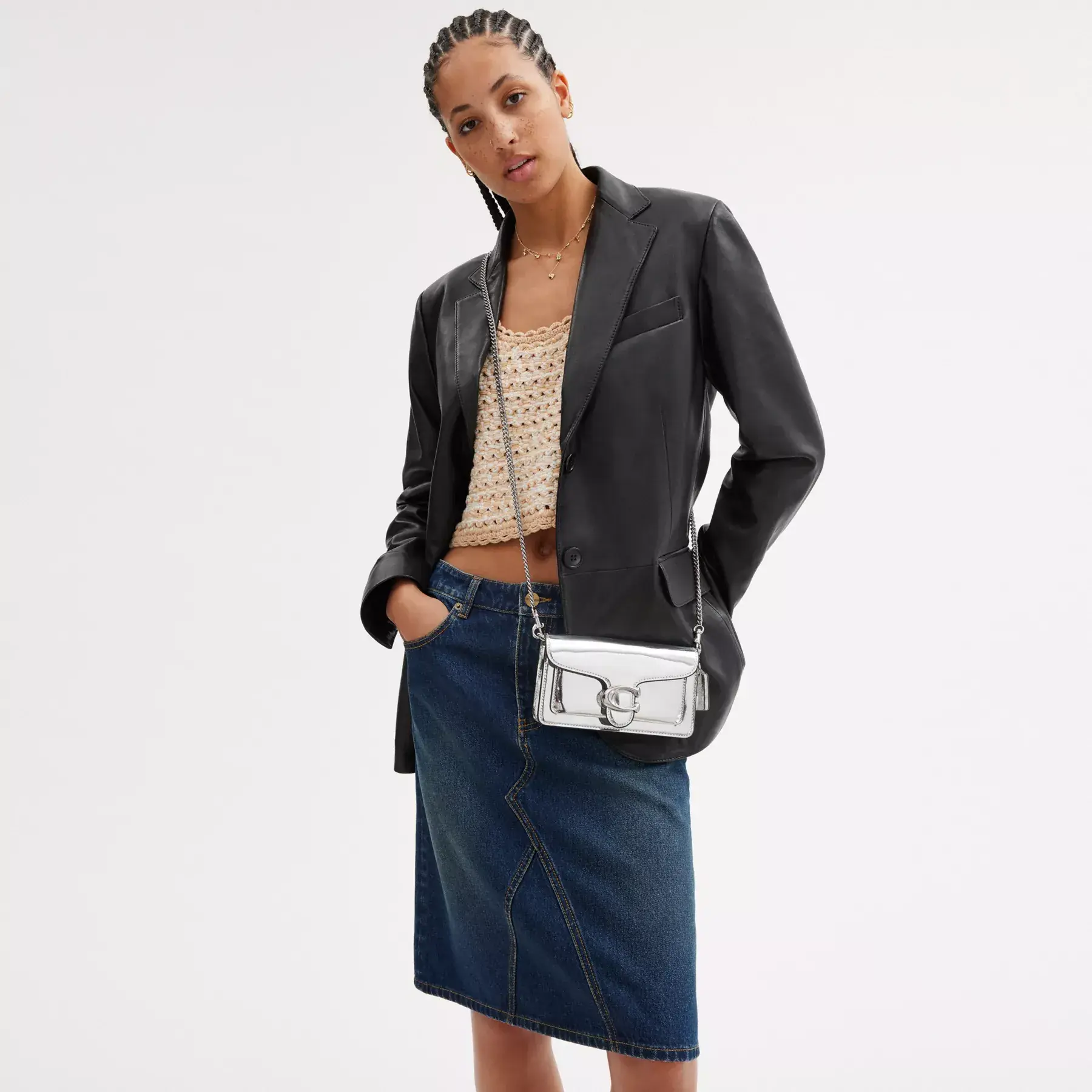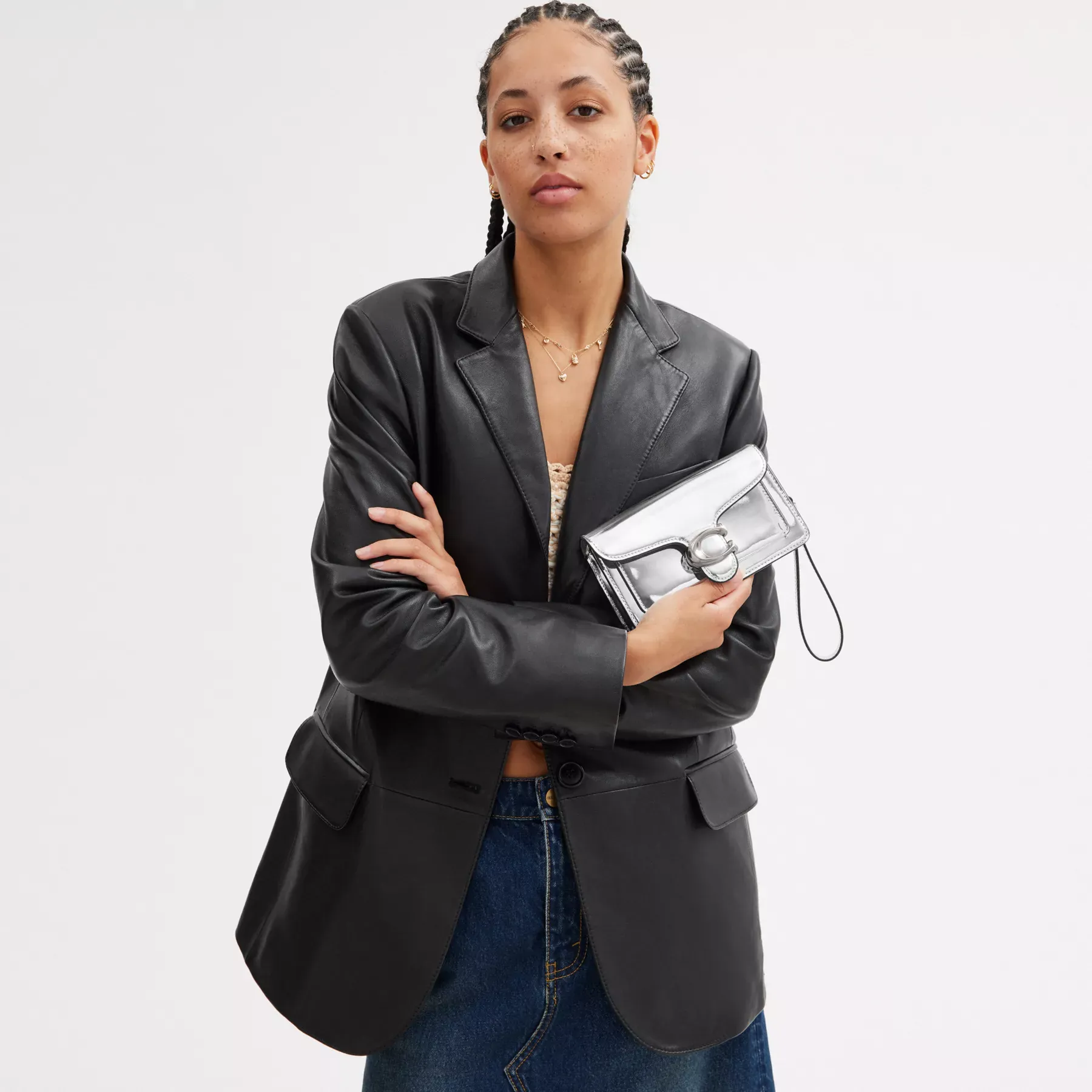 A modern take on an archival 1970s Coach design, our structured Tabby wristlet is crafted of lustrous mirror metallic leather. Finished with our Signature hardware, it’s perfectly sized for cards, cash and a phone with an exterior slip pocket for easy access to essentials. The versatile style can be carried as a wristlet or a clutch and worn crossbody with the elegant chain strap, making it the perfect choice for both dressed up and casual looks.