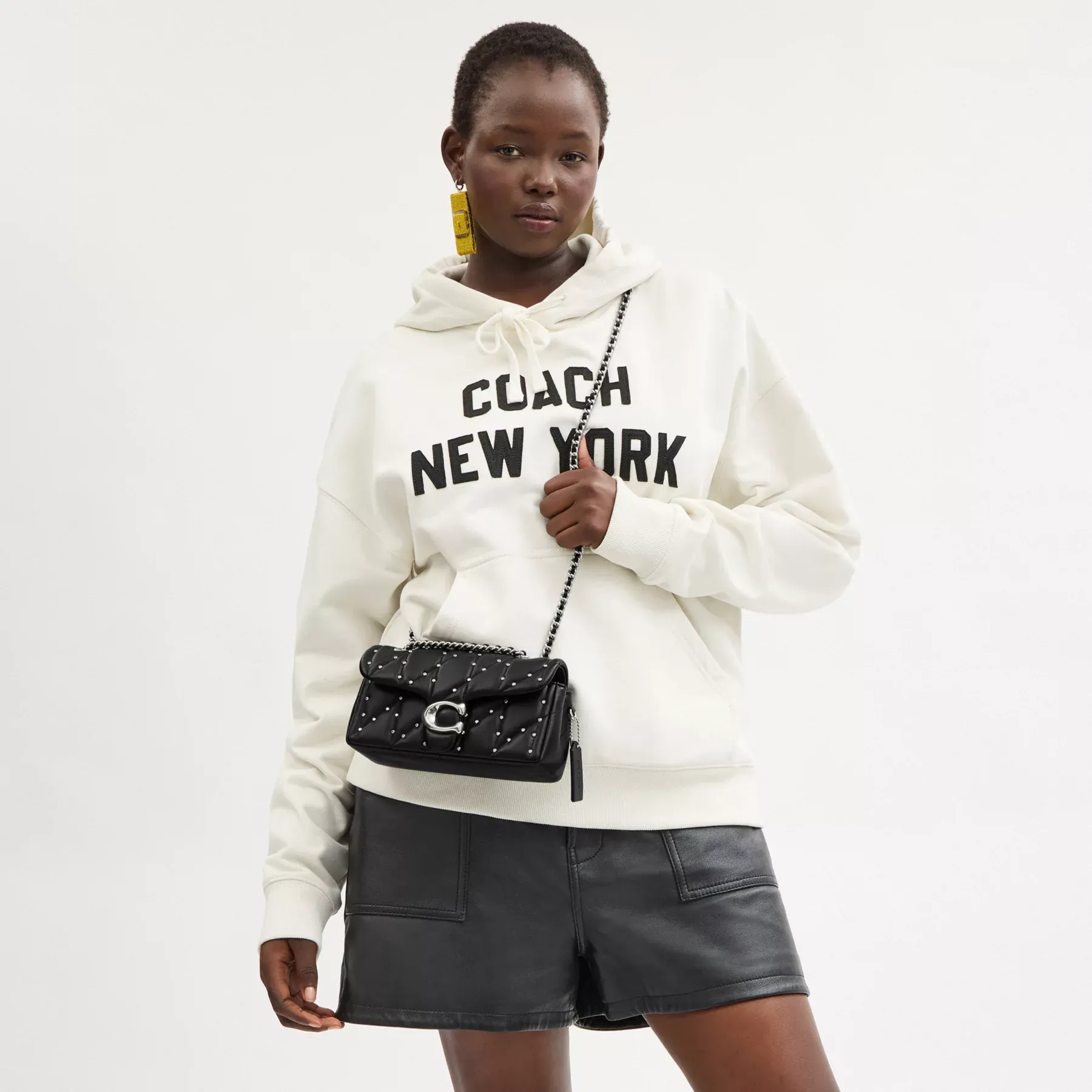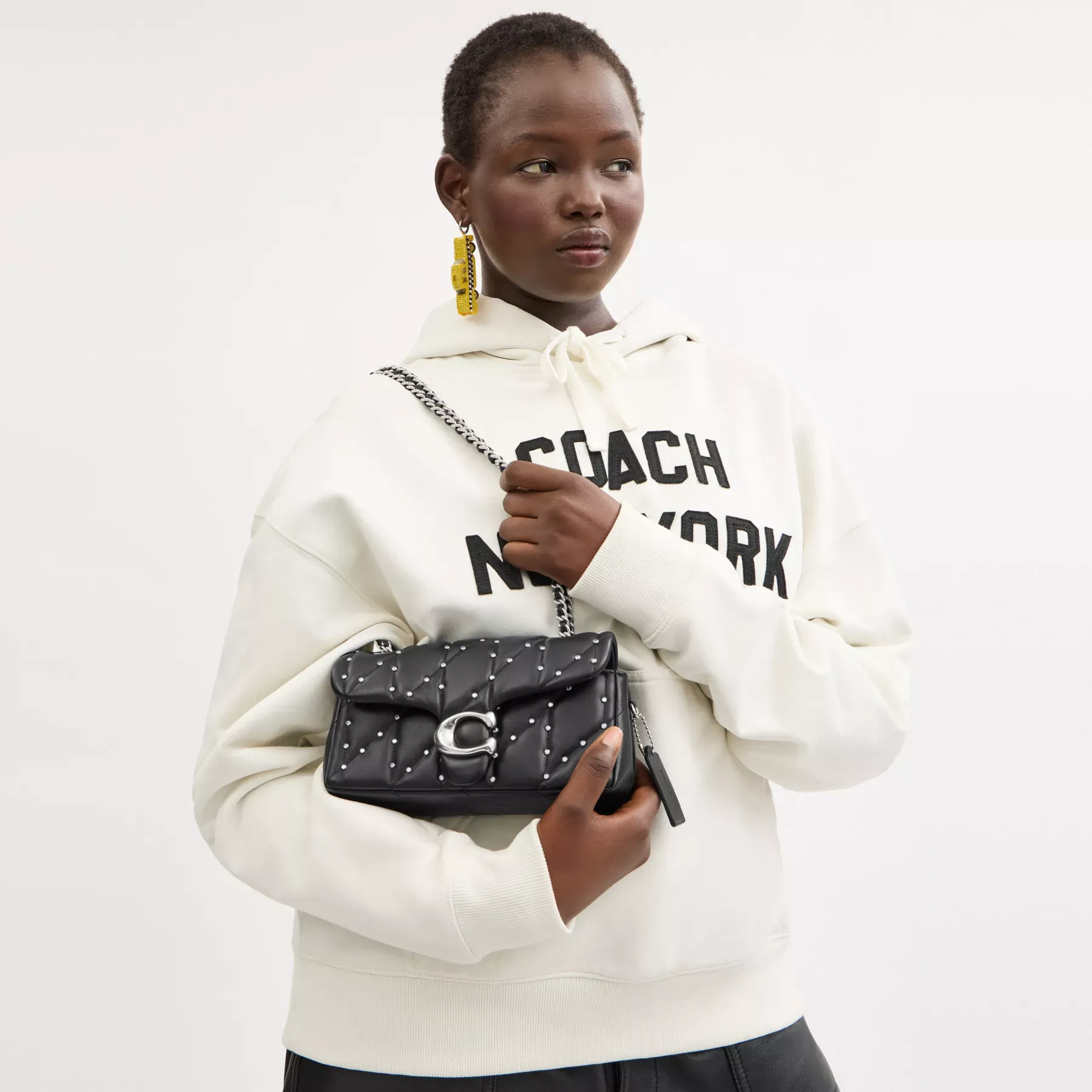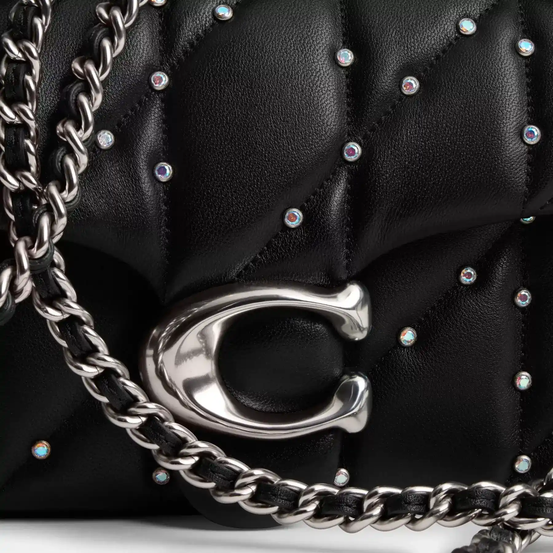 A modern take on an archival 1970s Coach design, our structured Tabby shoulder bag is crafted of luxe quilted nappa leather detailed with crystal rivets for a touch of sparkle. Smaller than the 26, the petite 20 features two detachable straps to carry by hand, style as a short shoulder bag or wear crossbody. It’s finished with our Signature hardware shimmering with pavé accents.