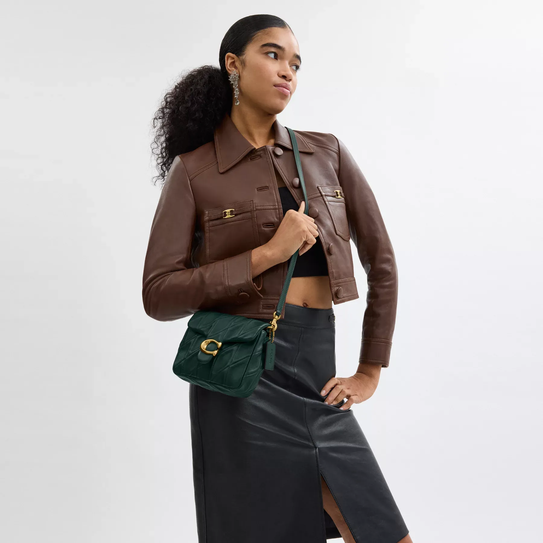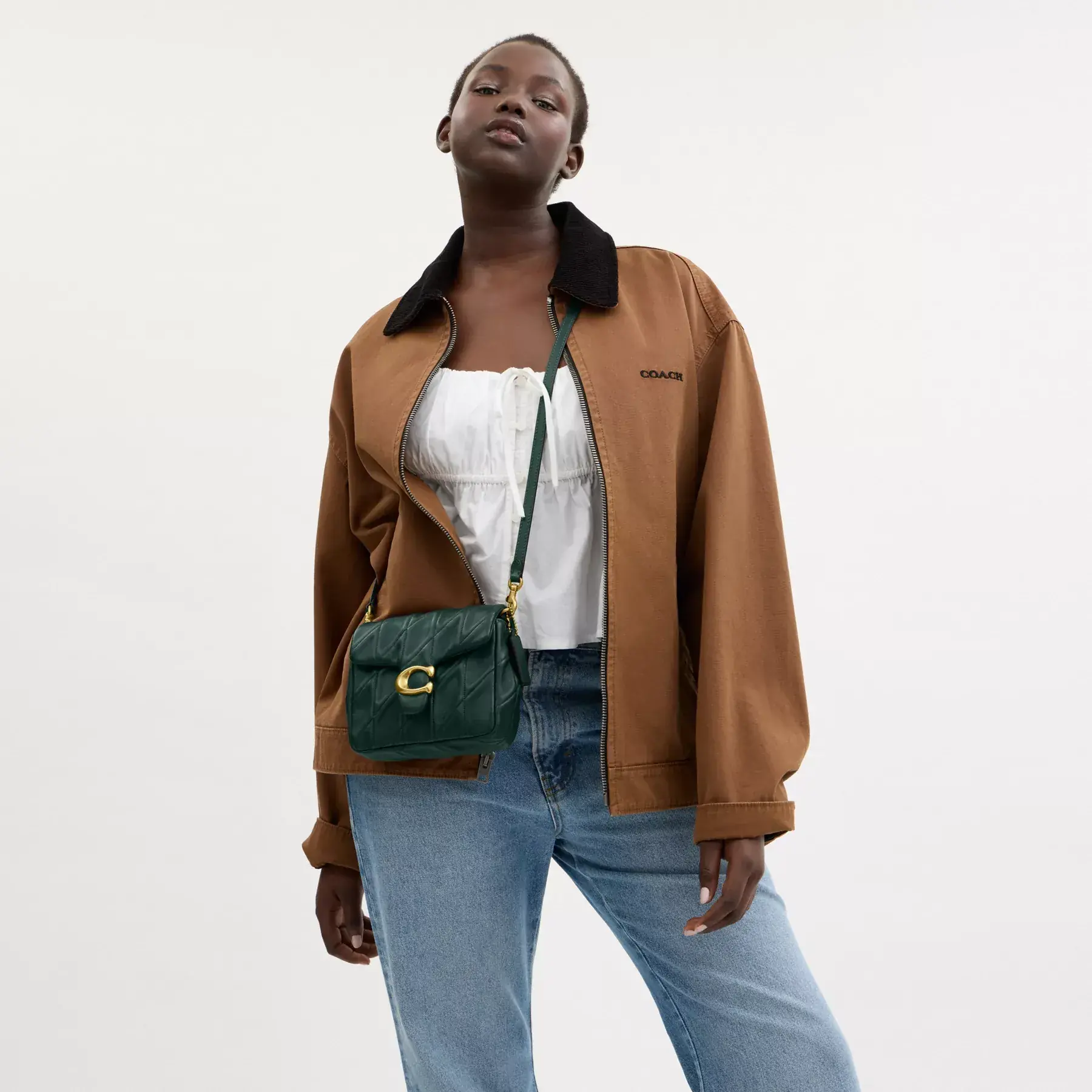 Inspired by the dynamic energy of our hometown New York City, the Times Square Tabby is a modern take on an archival 1970s Coach design. Crafted of quilted washed nappa leather and finished with our Signature hardware for an iconic touch, the petite 17 has room for a phone and features versatile styling options with an adjustable leather and chain strap to wear short or long on the shoulder and an adjustable leather crossbody strap.